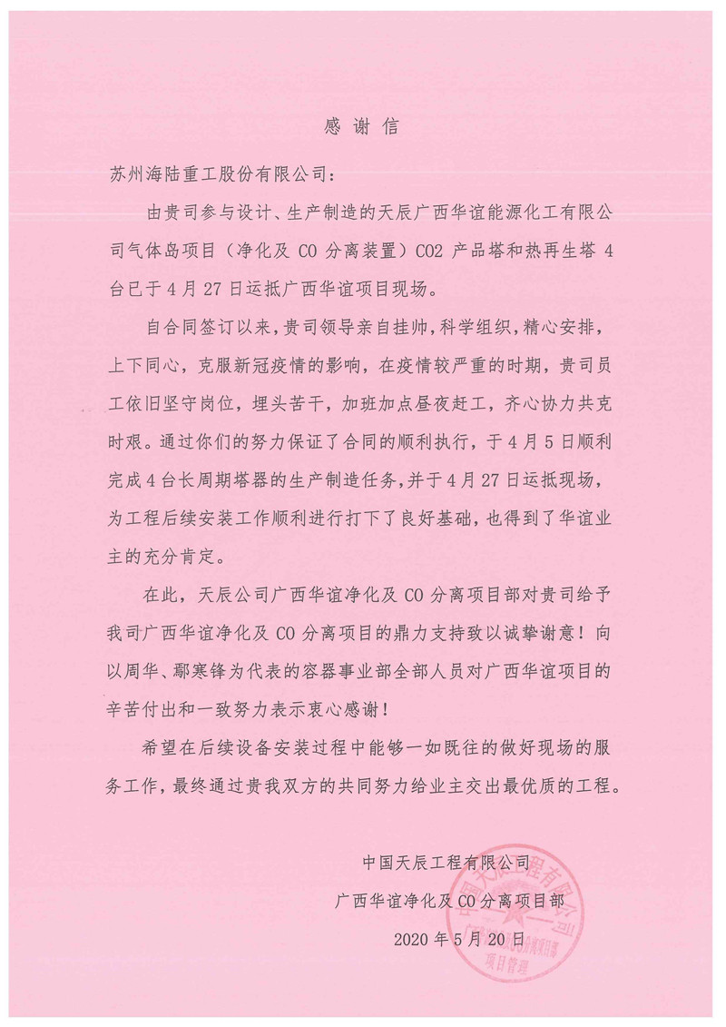 由于年初疫情的影響,廣西華誼項目現(xiàn)場出現(xiàn)了停工等待的不利局面,時間不等人,為保證客戶工期需求,“急客戶所急,想客戶所想”,海陸容器事業(yè)部全體干部職工上下同心,不畏困難,晝夜趕工,克服了疫情等諸多不利因素的影響,最終如期將產(chǎn)品交付客戶手中。