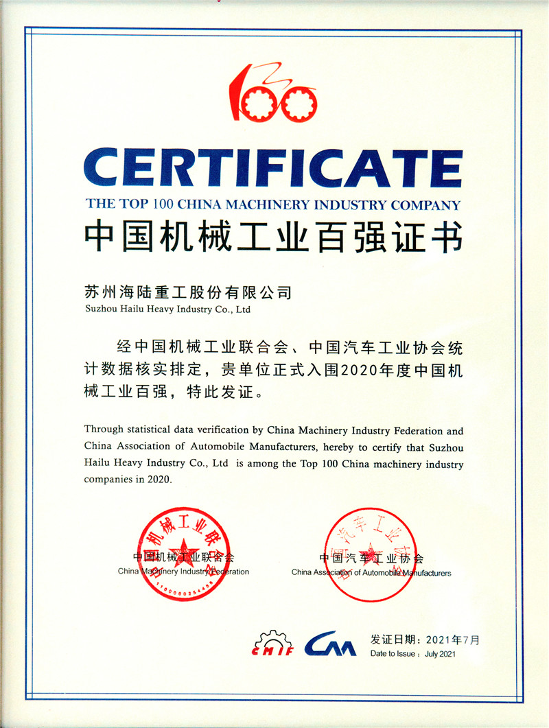 蘇州海陸重工股份有限公司榮獲“中國機械工業(yè)百強企業(yè)”榮譽稱號